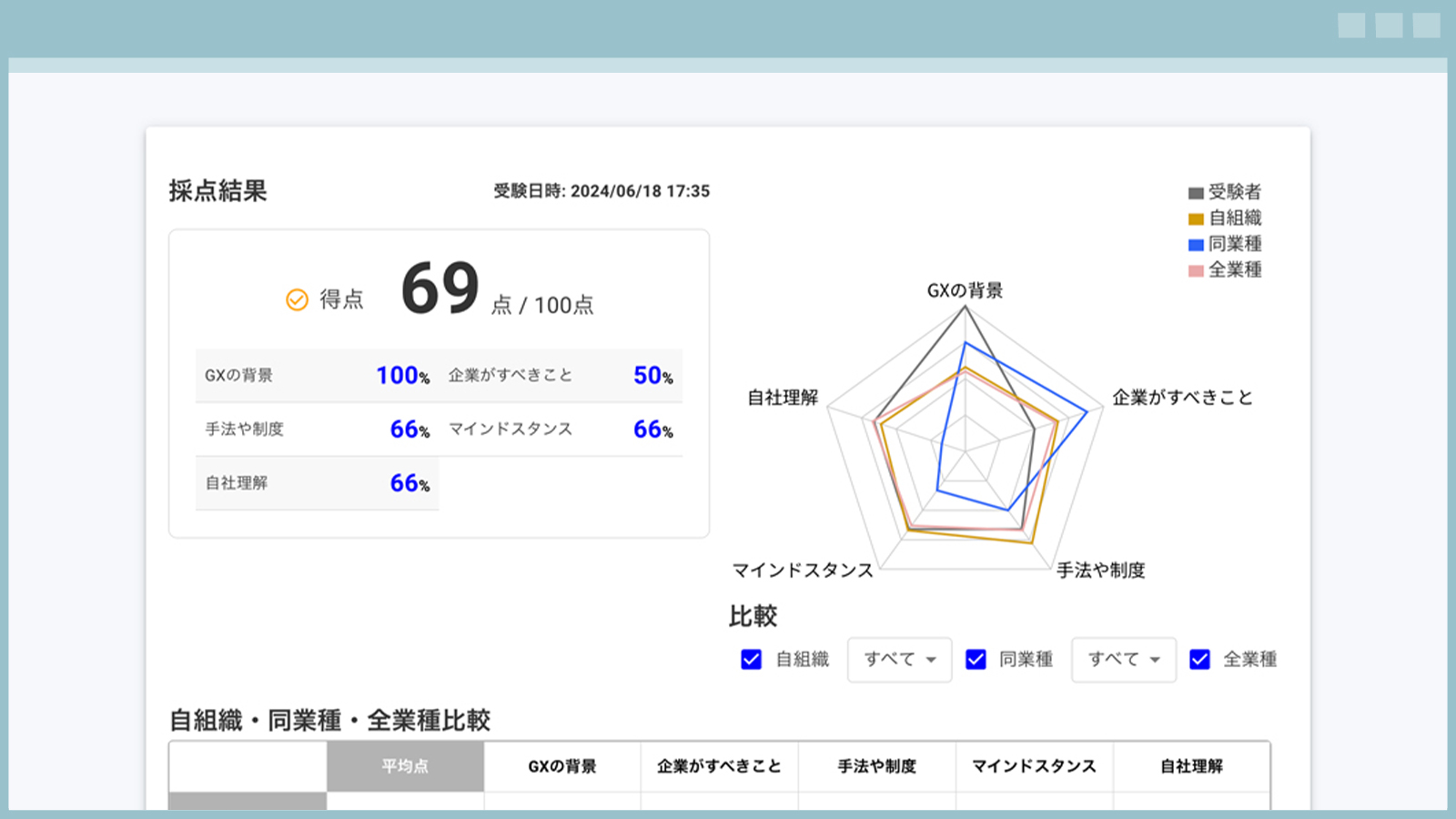 GXの背景、GXの内容、GXの方法、マインド・スタンス、自社の取組の5項目から受検者のスキルを定量評価。レーダーチャートで対策するべき項目を明確にすることで、効率よく人材育成を行うことができます。