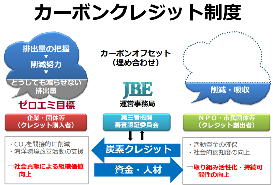 そもそもカーボンオフセット制度とは、削減努力をした上で削減できなった分のCO2がある場合、CO2排出削減につながる活動に投資することなどで埋め合わせる制度です。ブルーカーボンに特化した本制度を、ブルーカーボン・オフセット・クレジット制度(Jブルークレジット)といいます。