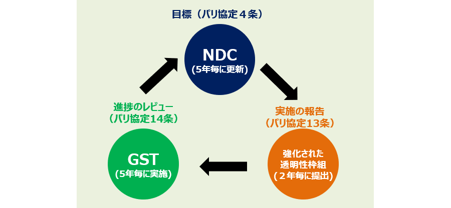 - グローバル・ストックテイク(GST)とNDC(自国の温室効果ガスの排出削減目標)の関係