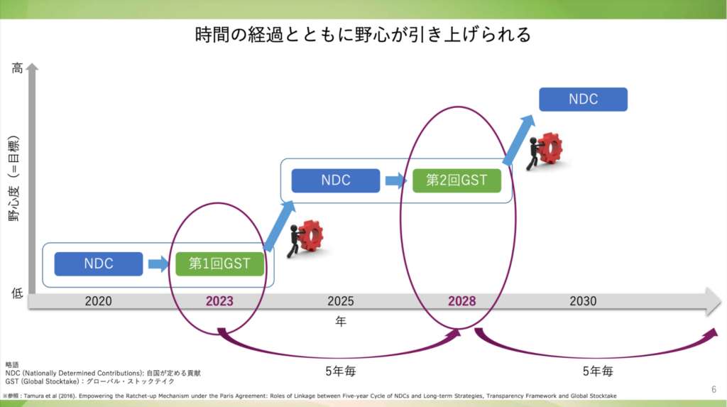 グローバル・ストックテイク(GST)は5年ごとに実施され、次の5年に向けたNDC提出時に活用され、野心度を引き上げる際の科学的な根拠や政策に生かされていきます。