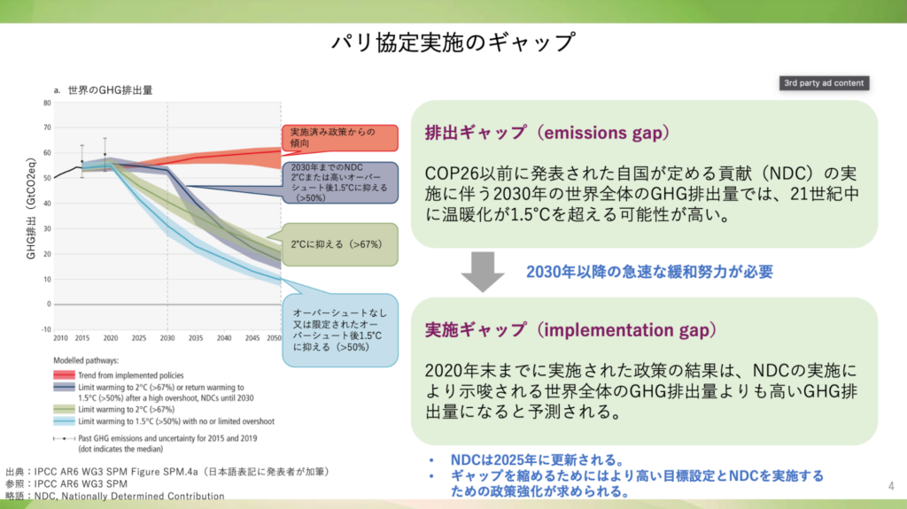 つまり、パリ協定で定められた目標達成に向けて温室効果ガスの取り組みにおける「排出ギャップ」と「実施ギャップ」との溝を埋めるのが、グローバル・ストックテイク(GST)の重要な役割となっています。