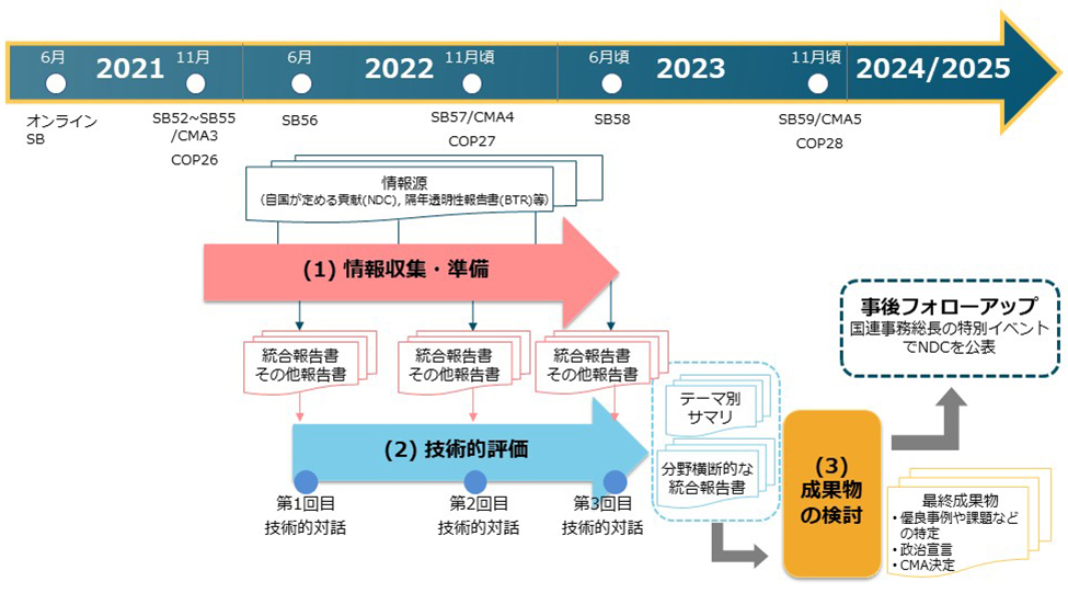 グローバル・ストックテイク(GST)は、「情報収集」「技術的評価」「成果物の検討」の3つのプロセスで構成され、全体で約2年をかけて進行します。