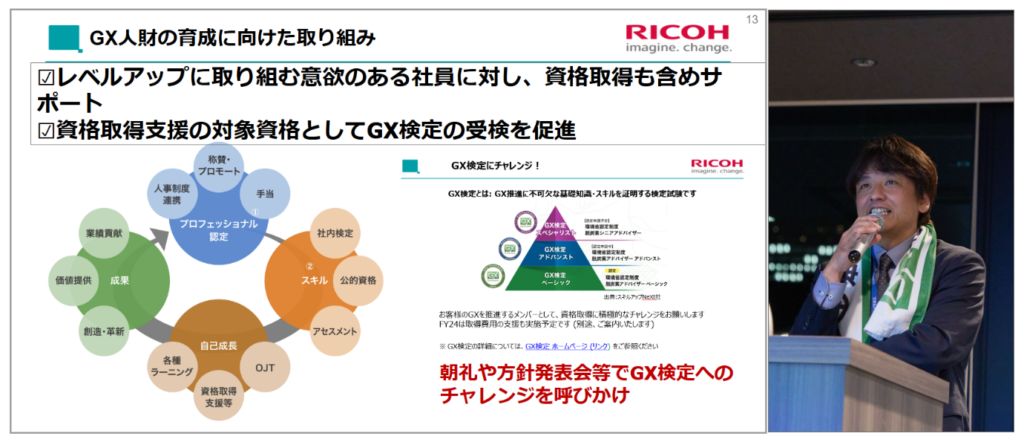 トップからの発信、ボトムアップからの浸透、両方からアプローチするリコー全社で取り組む社員教育・啓発活動や、レベルアップに取り組む意欲のある社員に対しての資格取得支援として「GX検定」の受験を促進し、人事制度にも連携させていることについてお話いただき、GX人材育成に関する先進的な取り組みについて、参加者は熱心に耳を傾けていました。