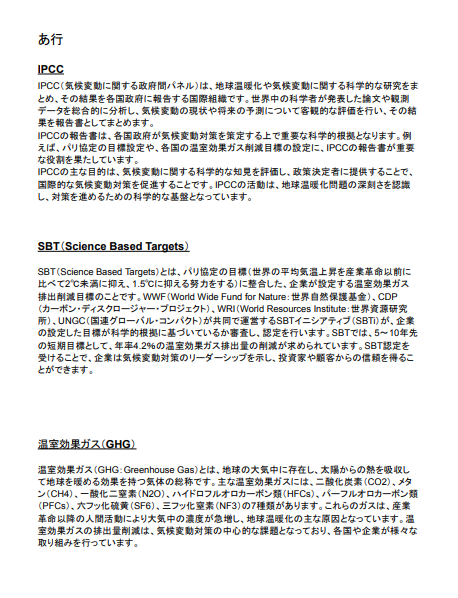 例えば、「カーボンフットプリント」や「生物多様性」、「カーボンオフセット」等の日常生活では聞きなじみのない単語が散見されます。